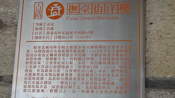 這是台北市內僅見的巴洛克式獨棟日治時期所遺留之洋樓,實彌足珍貴。幾年前市府委外經營,曾做為骨董及攝影資料之展示場,我於2010年前往參觀過,如今再度光臨,卻因尚在招標之中,無新廠商進駐,只好拍幾張外觀照就悻然離去。