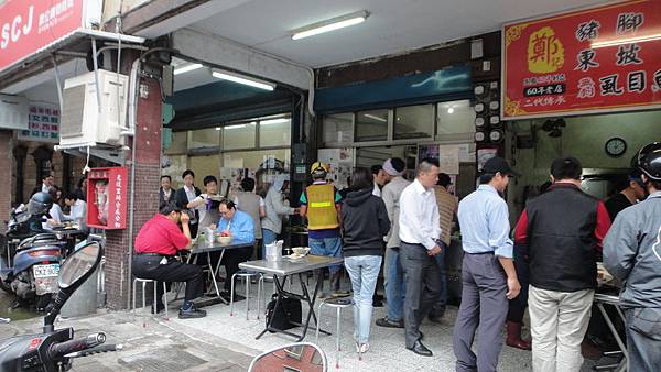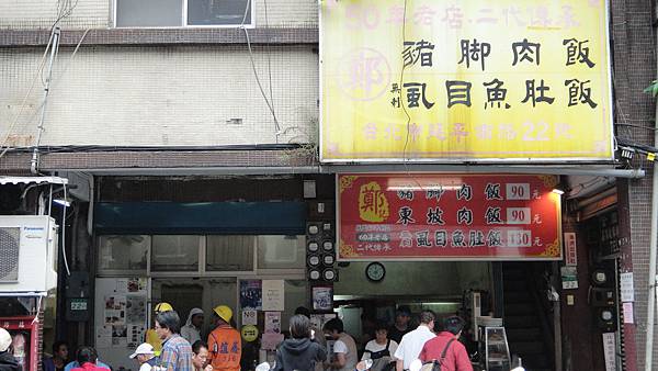就在洋樓旁的延平南路22號有一家號稱六十年歷史、二代傳承的鄭記「豬腳肉飯」小吃店,正值中午用餐時分,生意好到不行,根據台北市政府提供的「台北古早味美食巡禮」中所介紹:該店早期原在中華路的中華商場(1992年已拆除)經營,至今美味不改,除供應豬腳肉,還有東坡肉、虱目魚肚、滷蛋、滷大腸等(請參照相片),看到顧客吃得津津有味,應是名不虛傳。